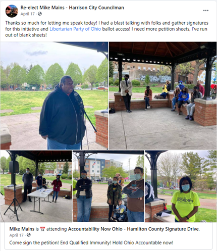 Back on April 17th I attended the Accountability Now Ohio – Hamilton County Signature Drive, and I gave a speech about ending qualified immunity, Ohio’s restrictive ballot access laws and Ranked Choice voting. I spoke specifically about Libertarian congressman Justin Amish’s simple 3 and ½ page bill to end Qualified Immunity. It’s my understanding that this bill was the first ever to receive tri-partisan support with Amash as the sponsor, along with Republican Tom McClintock and several Democrats as co-sponsors.