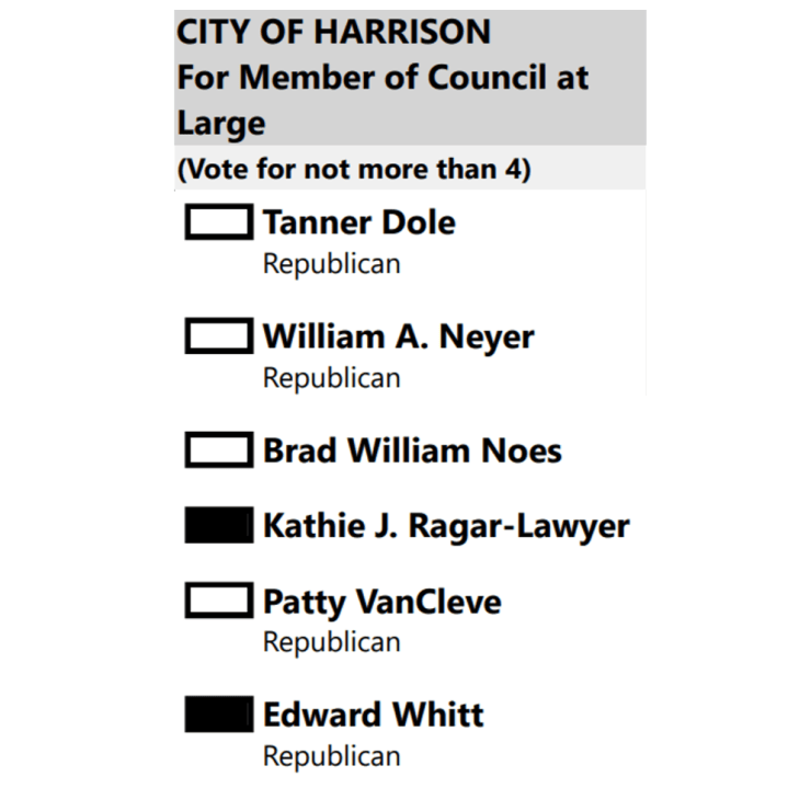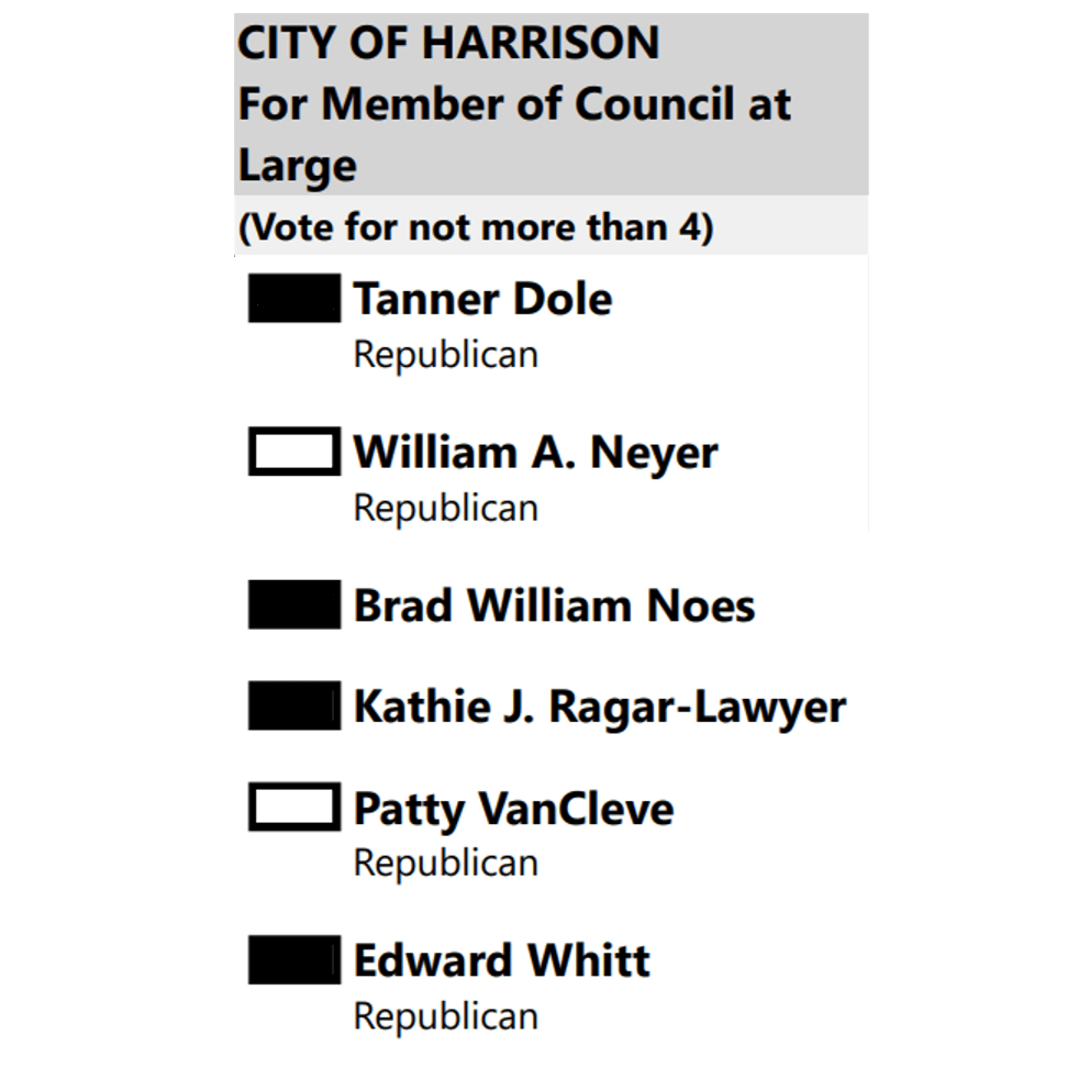 There are many ways to vote in next Tuesdays competitive council race. You may vote for one candidate, two candidate, three candidate or four candidates. If you have one that stands out amongst the rest: a candidate that is far and away superior, a friend or family member, just vote for one. When I ran for council it was suggested that my friends and family, including myself vote for just one candidate, me! The same would be true if you had two candidates that were clearly your favorite. I did this in 2021 when Combs On Harrison and me ran together as a team. In 2023 I left my ballot blank for mayor and council because I was disappointed that all four candidates ran unopposed, you could argue that our votes didn’t count for much in 2023. This year is a bit more exciting with 6 conservative candidates running for four open seats.